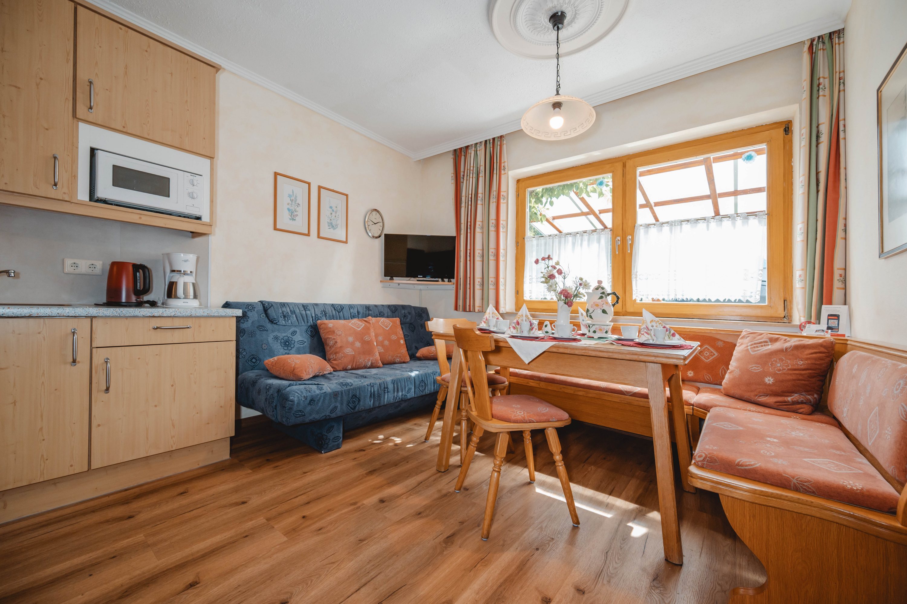 Küche mit Sitzecke und Fernseher (Geschirrspüler, Mikrowelle, Backrohr, Kaffeemaschine, Wasserkocher, Toaster, u.v.m.)